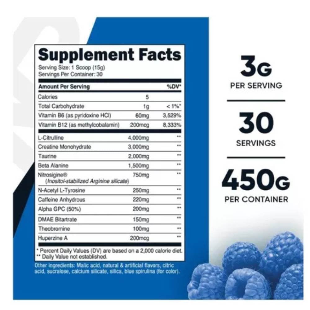 Pre Entreno diseñado para maximizar tu energía, fuerza y enfoque en cada sesión. Su fórmula avanzada con cafeína, beta-alanina y citrulina malato impulsa el rendimiento, retrasa la fatiga y potencia el bombeo muscular. Ideal para entrenamientos intensos, te ayuda a alcanzar nuevas metas sin azúcares añadidos ni conservantes. Absorción rápida y resultados inmediatos. ¡Despierta tu potencial y domina cada entrenamiento con nuestro Pre Entreno!