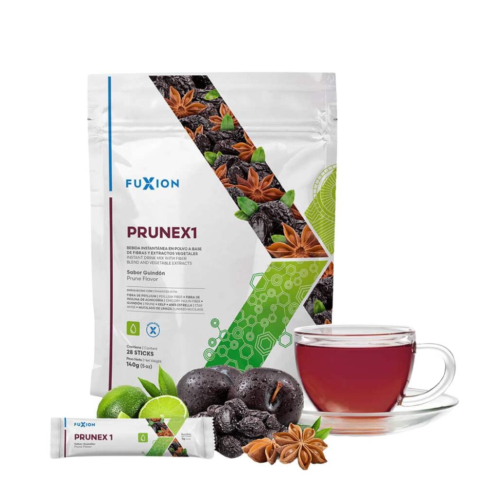 Prunex 1 de Fuxion: Bienestar digestivo y detox natural Este té herbal, formulado con fibras solubles (psyllium, inulina de achicoria, mucílago de linaza), guindón, kelp y anís estrella, ayuda a aliviar la hinchazón, promover un tránsito intestinal saludable y eliminar toxinas de tu organismo. Ideal para quienes buscan sentirse más livianos y mejorar su bienestar digestivo de forma natural. Prunex 1 es tu aliado para una limpieza interna y equilibrio integral. ¡Descubre sus beneficios hoy mismo!